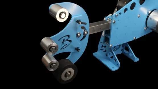 Available in either kit form or (by special order) as a fully painted and assembled unit, it comes with a mounting bracket, dual contact wheels, and all the necessary hardware to mount on your Brodbeck Ironworks platen arm.