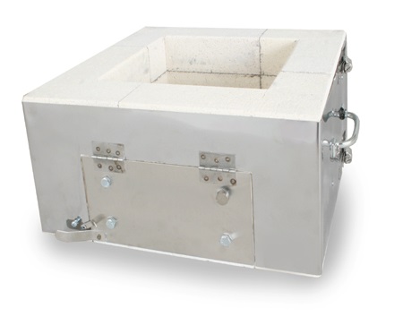 The Caldera-E collar has no heating elements. For this reason, the Caldera-E collar will slow down the firing rate of the Caldera and Caldera-S and reduce the maximum temperature to 1500°F (815°C). The collar is made of 2 ½” thick hand-selected insulating refractory firebricks. The firebricks, wrapped in heavy-gauge stainless steel, store heat for minimal heat loss after opening the door to remove a copper piece.