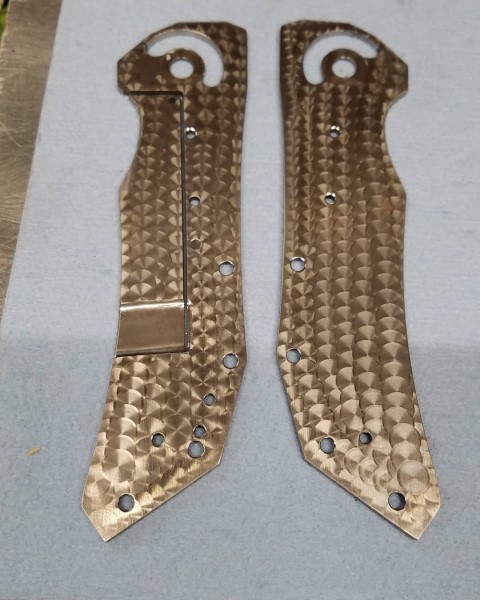 The jewlling jig can be used to put a decorative fish-scale-like jewelled pattern onto polished metal surfaces such as folding knife liners.