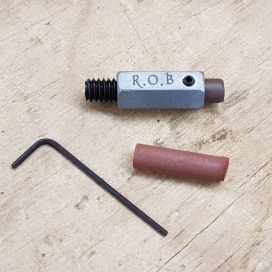 Tw0 6.35mm/.250″ Cratex rubberised abrasive sticks are included. The jig has two set screws – lock the Cratex at the desired depth with the small set screw, then hand tighten the large set screw in behind it to support it. Fix the jig in your drill or mill chuck, and for best results flatten off the Cratex tip on a piece of sandpaper before use. As the Cratex is worn down, unlock the small set screw and wind it out with the large set screw like a tube of lipstick.